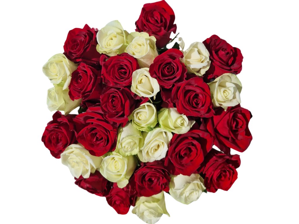 Kytice rudých a bílých růží délky 70 cm 31 kusů