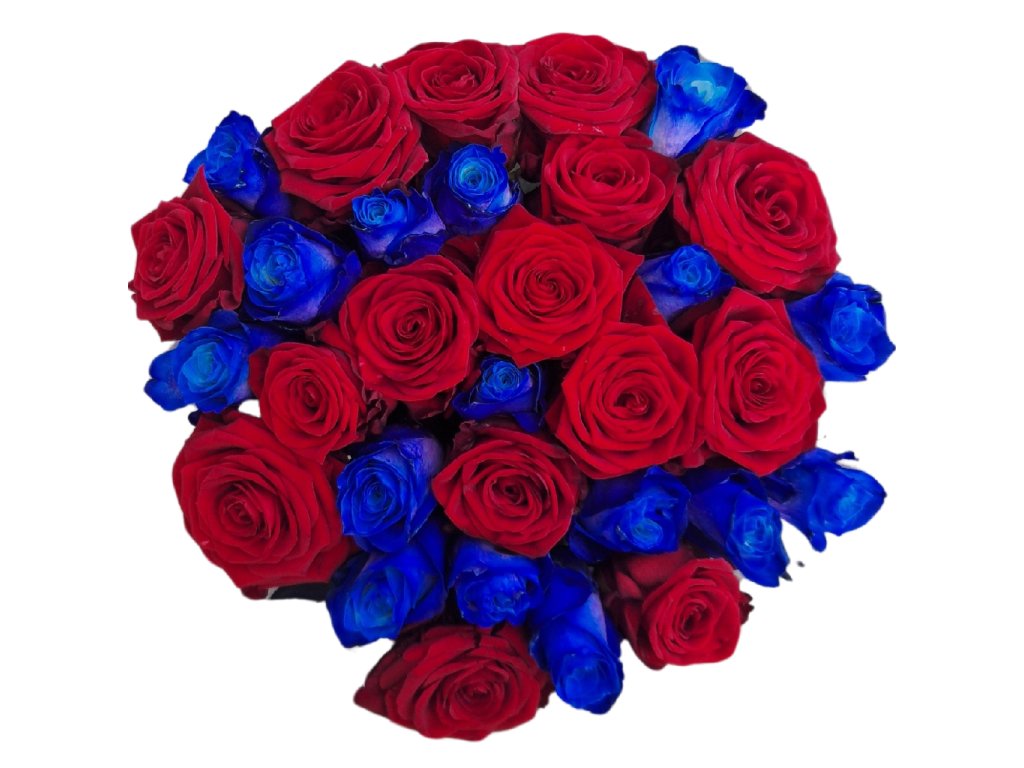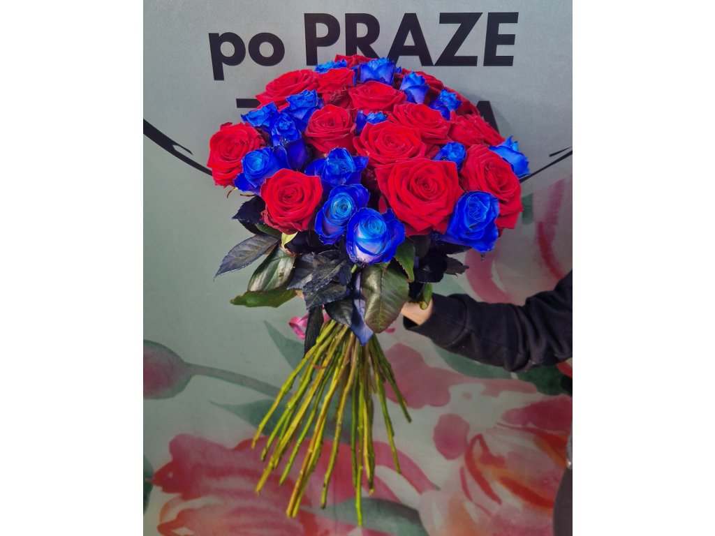 Kytice rudých a modrých růží délky 70 cm 21 kusů