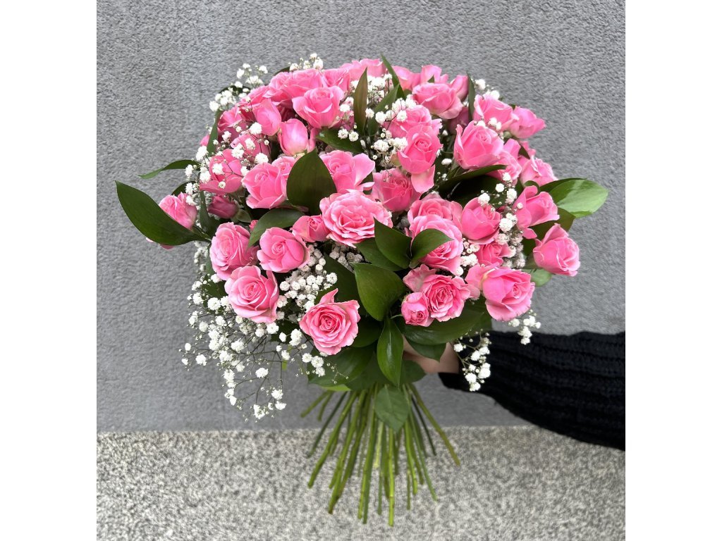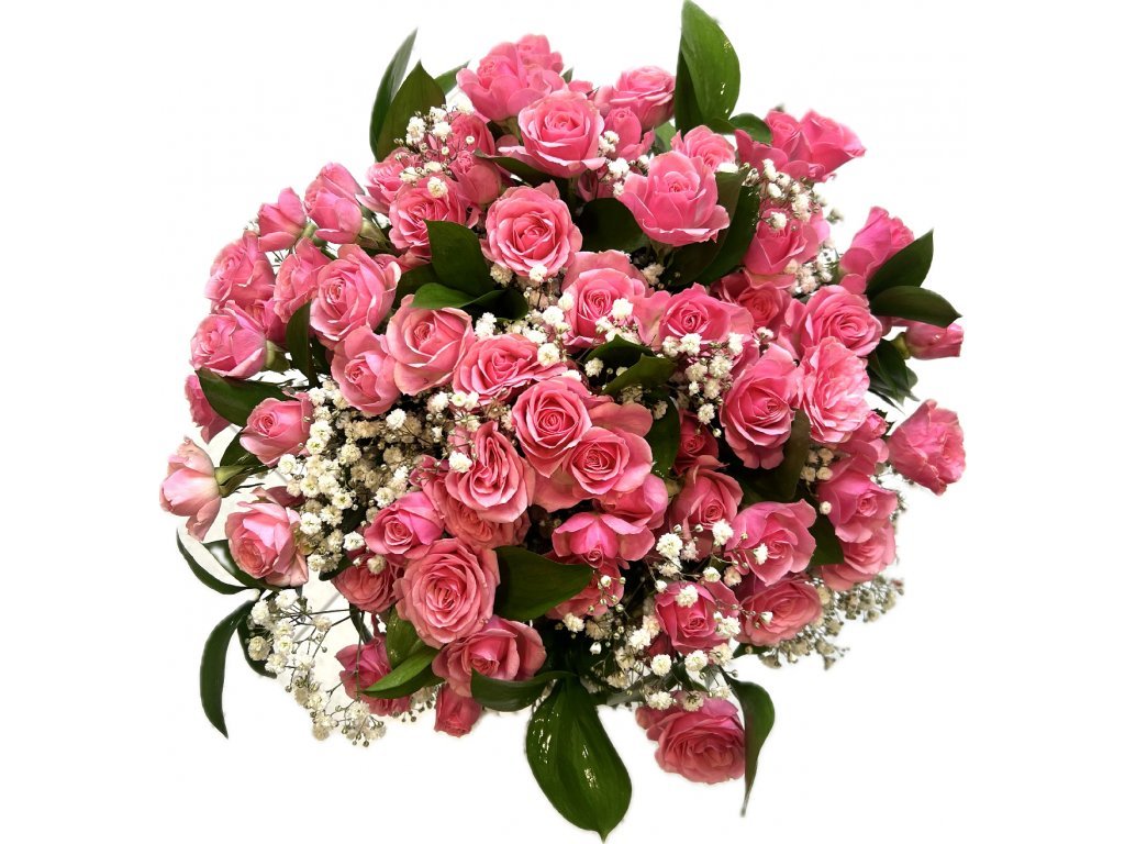 Krásná kytice z trsových růží, gypsy a ruscusu